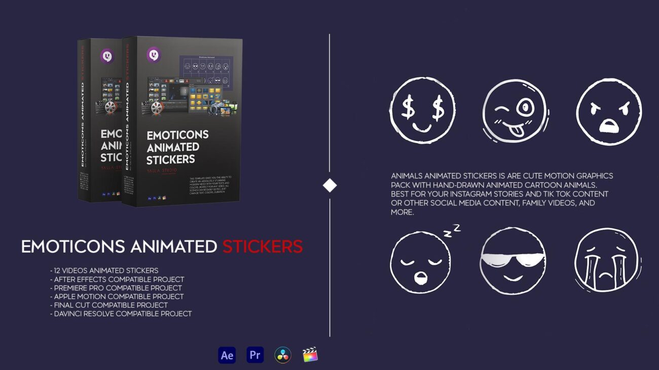 Emoticons Animated Stickers This template gives you the ability to create an absolutely stunning modern video with your texts and colors. Perfect for any video. All scenes can be easily edited. Just change colors, duration etc.