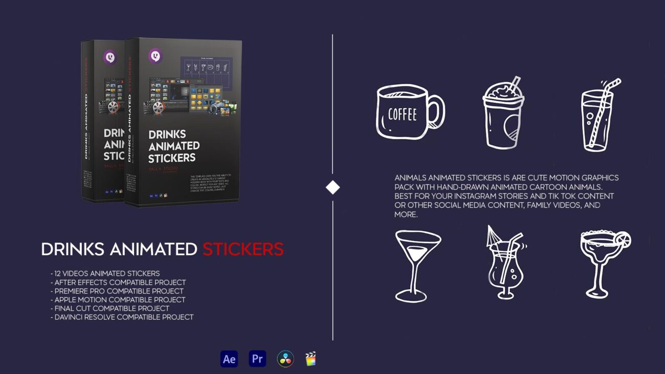 Drinks Animated Stickers This template gives you the ability to create an absolutely stunning modern video with your texts and colors. Perfect for any video. All scenes can be easily edited. Just change colors, duration etc.