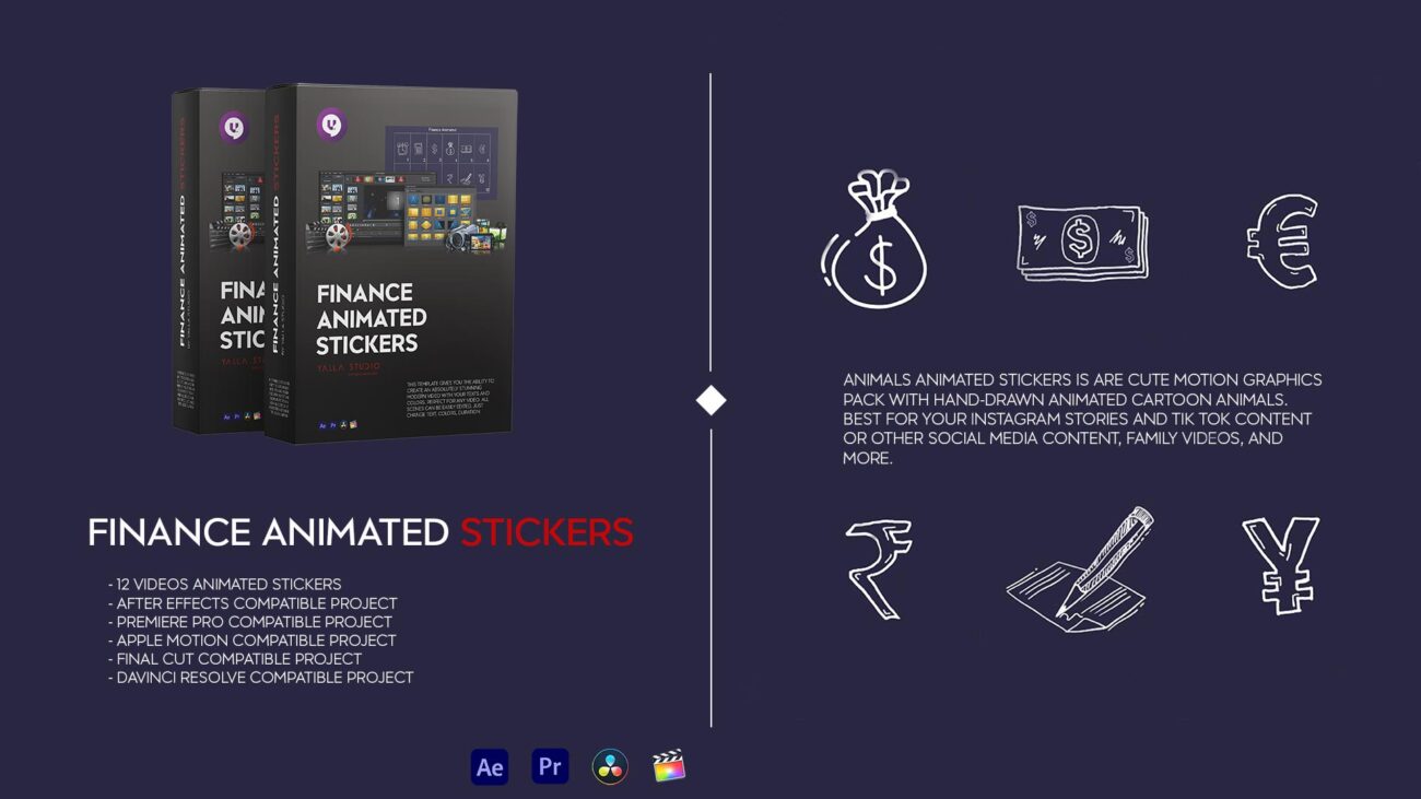 Finance Animated Stickers This template gives you the ability to create an absolutely stunning modern video with your texts and colors. Perfect for any video. All scenes can be easily edited. Just change colors, duration etc.