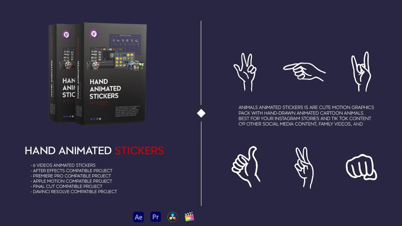 Hand Animated Stickers This template gives you the ability to create an absolutely stunning modern video with your texts and colors. Perfect for any video. All scenes can be easily edited. Just change colors, duration etc.