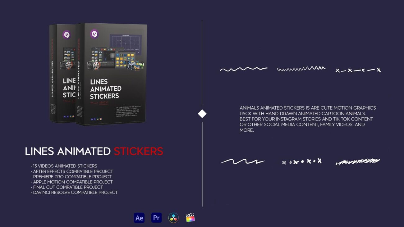 Lines Animated Stickers This template gives you the ability to create an absolutely stunning modern video with your texts and colors. Perfect for any video. All scenes can be easily edited. Just change colors, duration etc.