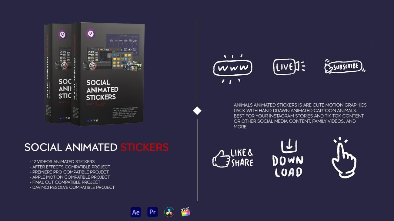 Social Animated Stickers This template gives you the ability to create an absolutely stunning modern video with your texts and colors. Perfect for any video. All scenes can be easily edited. Just change colors, duration etc.