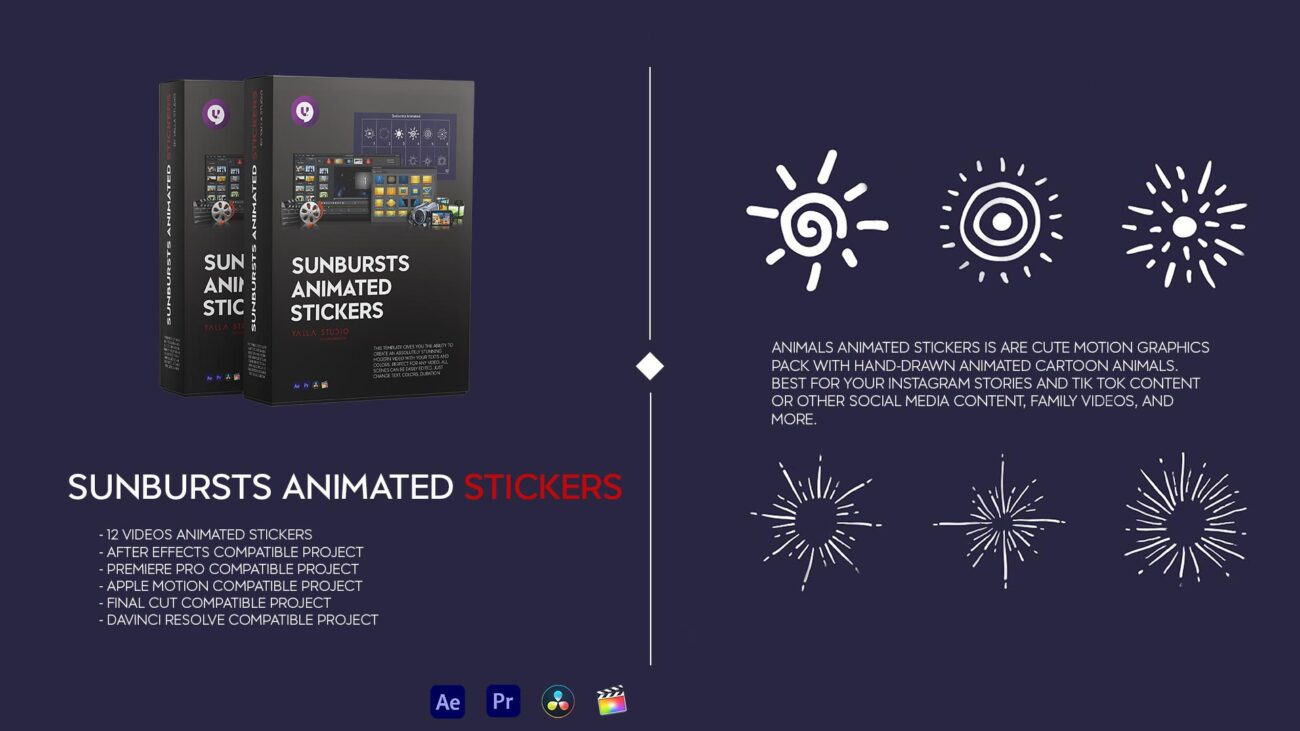 Sunbursts Animated Stickers This template gives you the ability to create an absolutely stunning modern video with your texts and colors. Perfect for any video. All scenes can be easily edited. Just change colors, duration etc.
