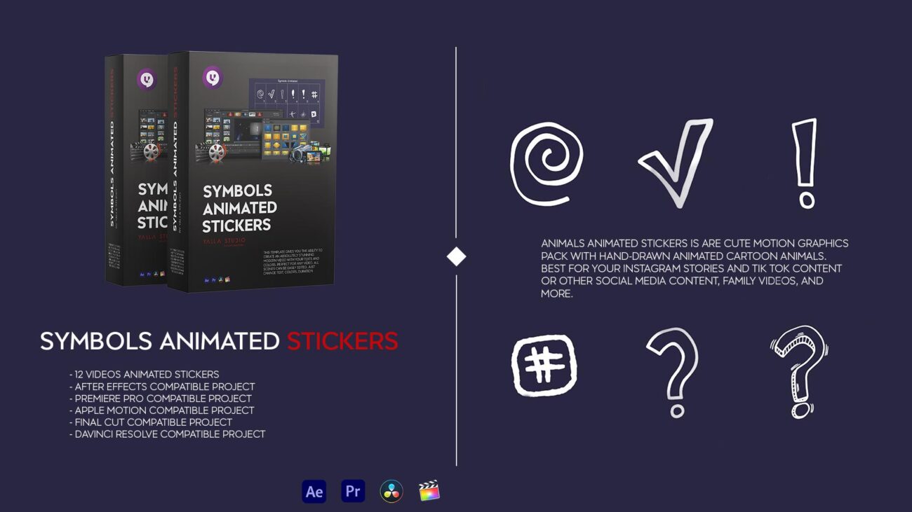 Symbols Animated Stickers This template gives you the ability to create an absolutely stunning modern video with your texts and colors. Perfect for any video. All scenes can be easily edited. Just change colors, duration etc.
