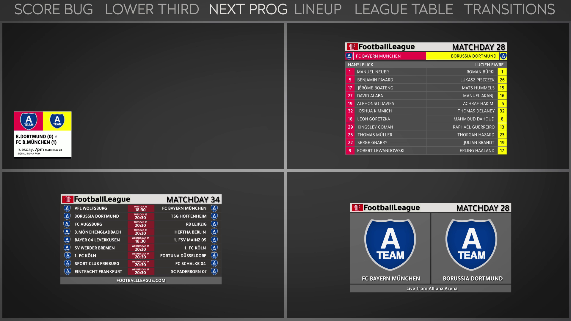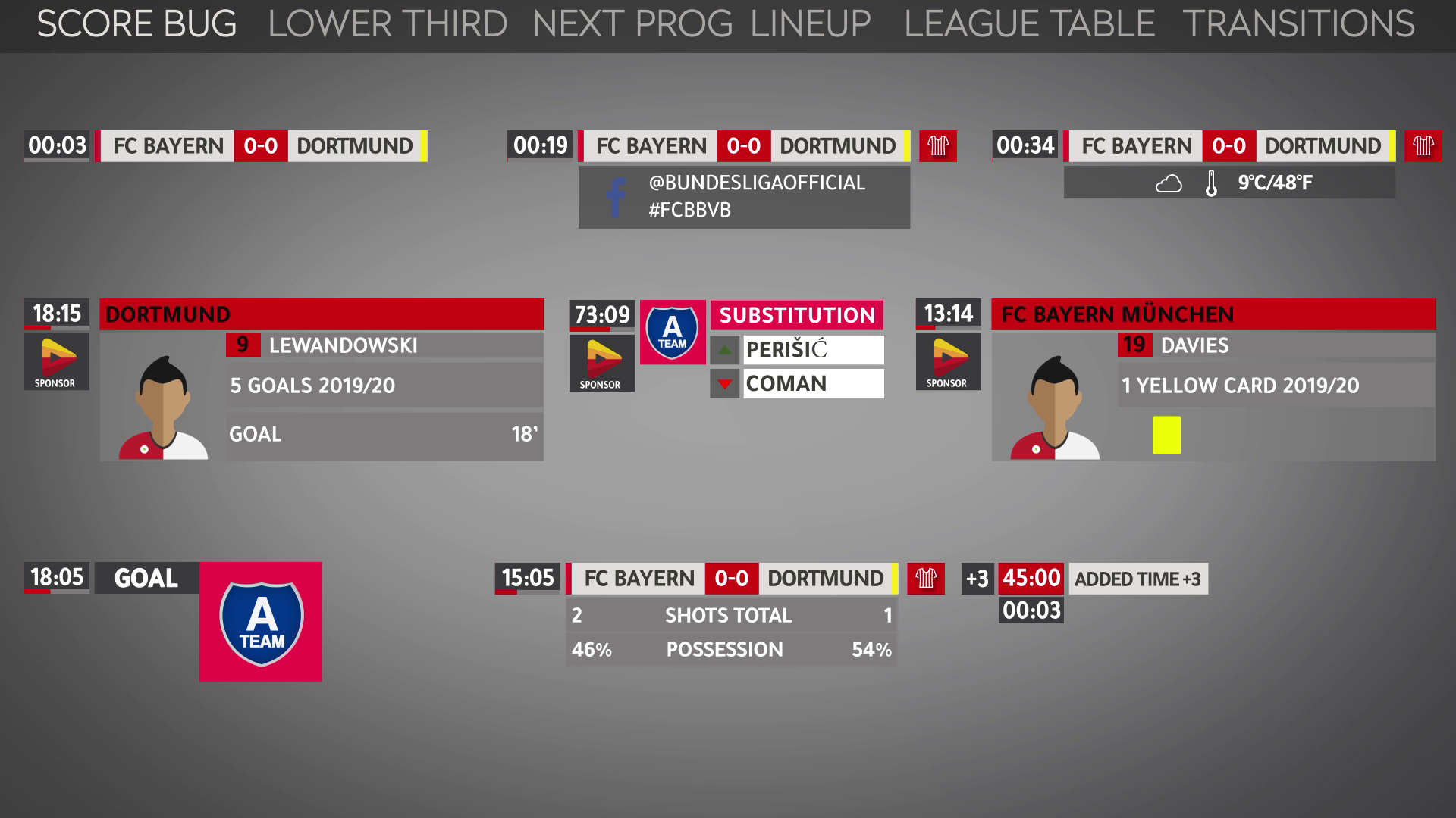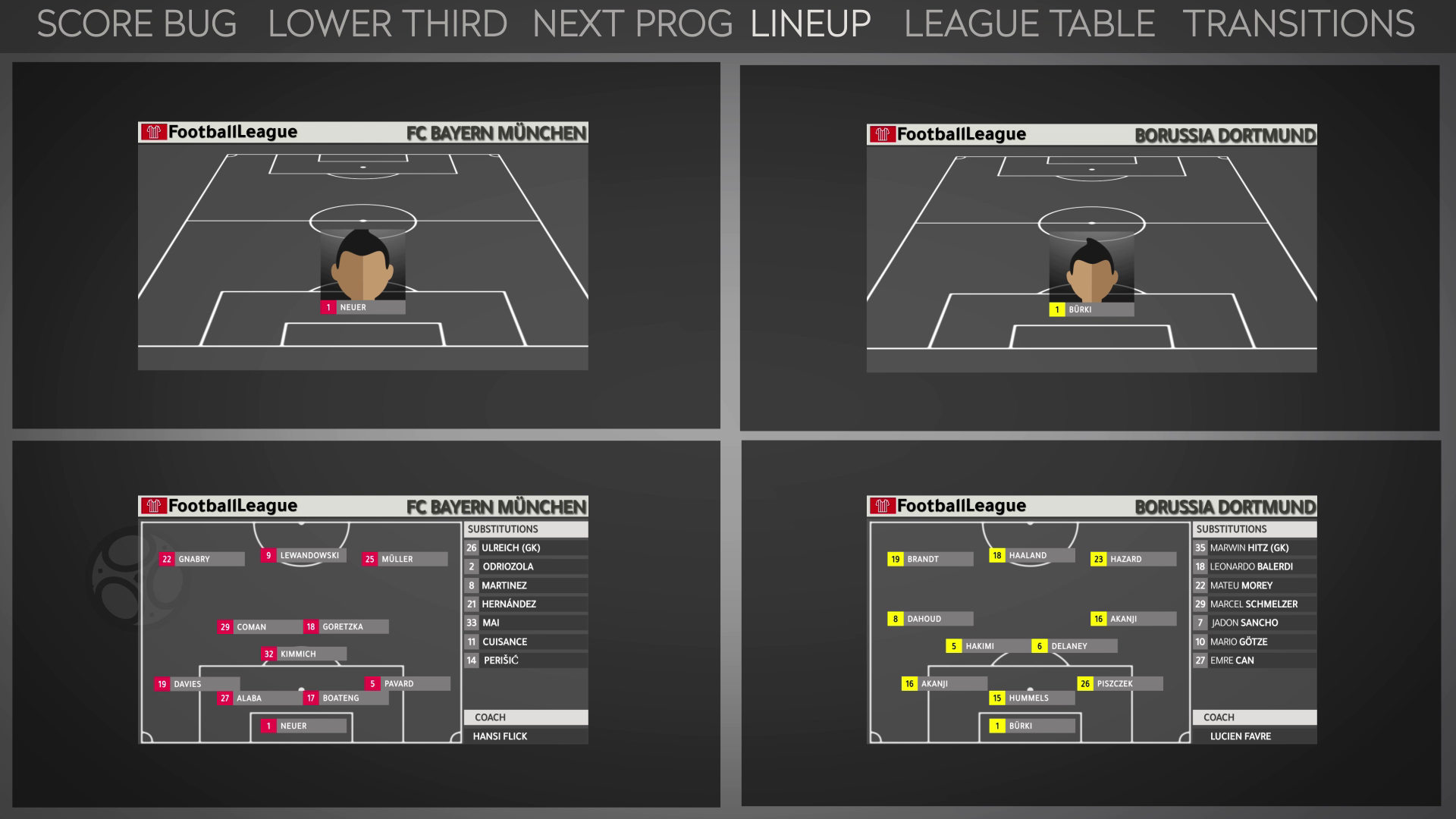 Football League Broadcast Graphics Package Ver.3.0 (Bundesliga) fully customizable within just a few clicks. Use control compositions to easily edit content and get your unique personalized template. With our platform you can also edit all competition related templates in the same window and preview it in real time. It is easier, faster and it saves you a lot of time.