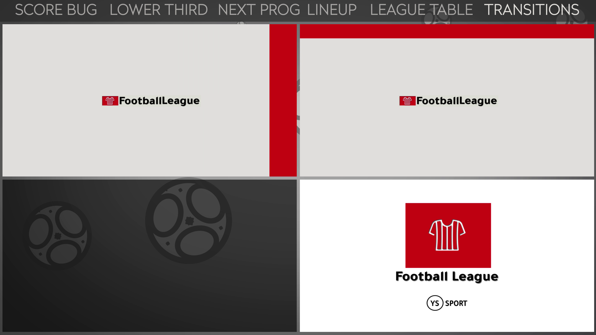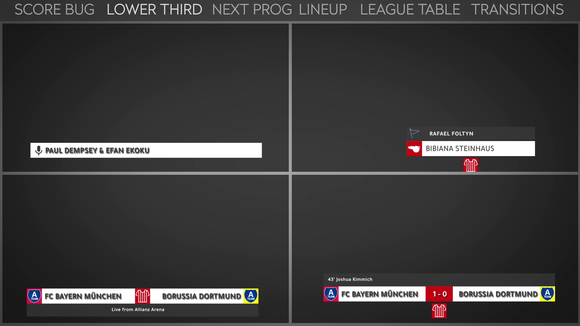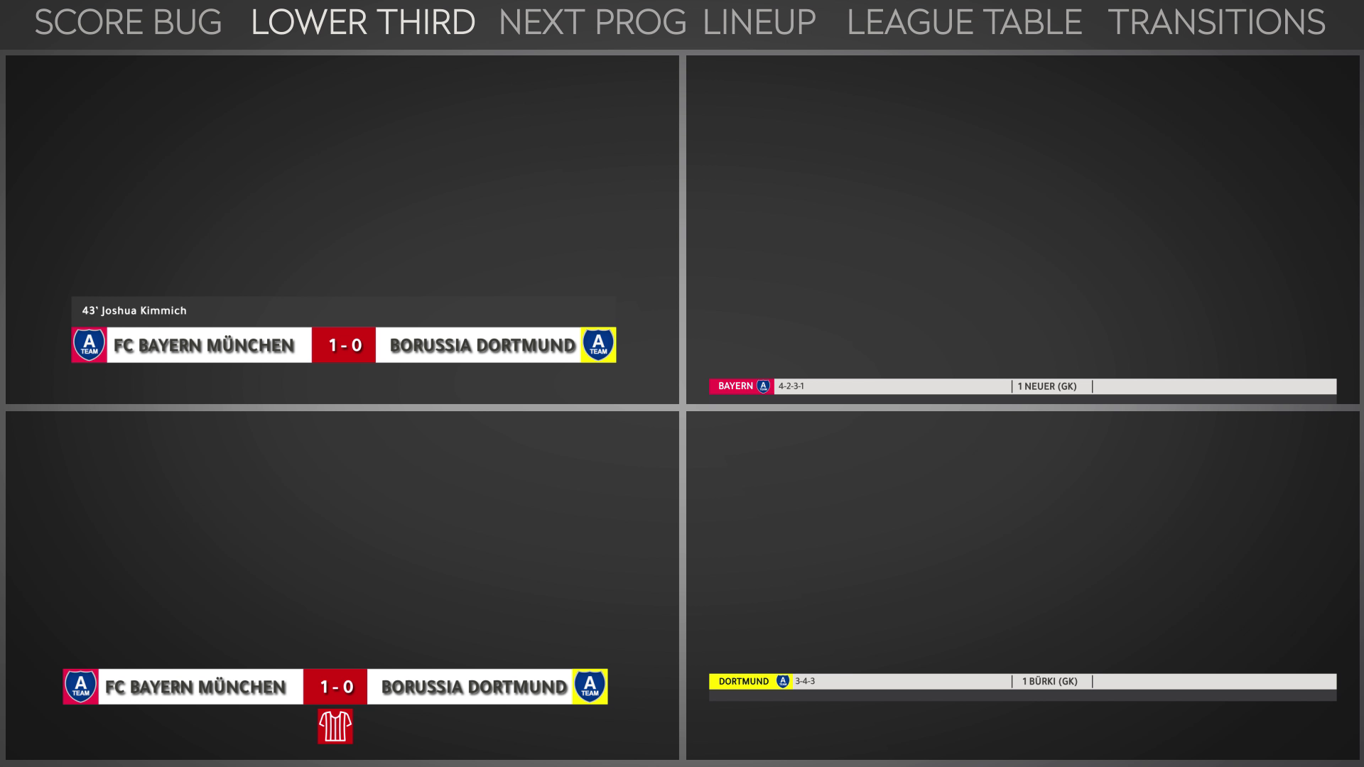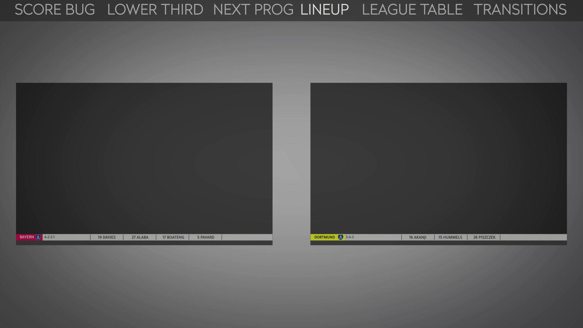 Football League Broadcast Graphics Package Ver.3.0 (Bundesliga) fully customizable within just a few clicks. Use control compositions to easily edit content and get your unique personalized template. With our platform you can also edit all competition related templates in the same window and preview it in real time. It is easier, faster and it saves you a lot of time.