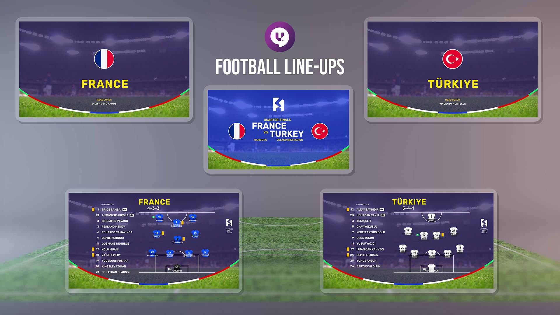 Football Line-ups MOGRT For Premiere Pro created for a Soccer Championship. Package includes Line Up 11VS11 elements needed for On-air live broadcasting. Super easy to customize, choose your text layer and update the required text, add your own images and video and you are done! All editing is done with The Essential Graphics panel in Premiere Pro andAfter Effects for ultimate familiarity and ease of use.