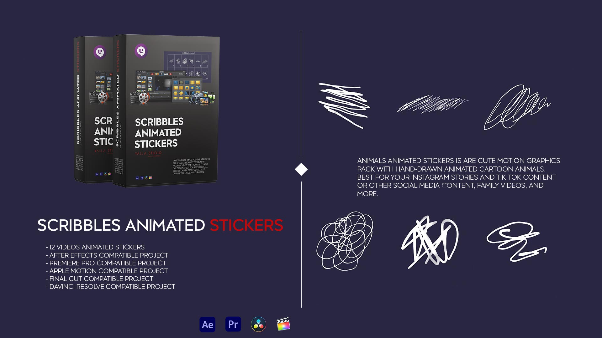 Scribbles Animated Stickers This template gives you the ability to create an absolutely stunning modern video with your texts and colors. Perfect for any video. All scenes can be easily edited. Just change colors, duration etc.